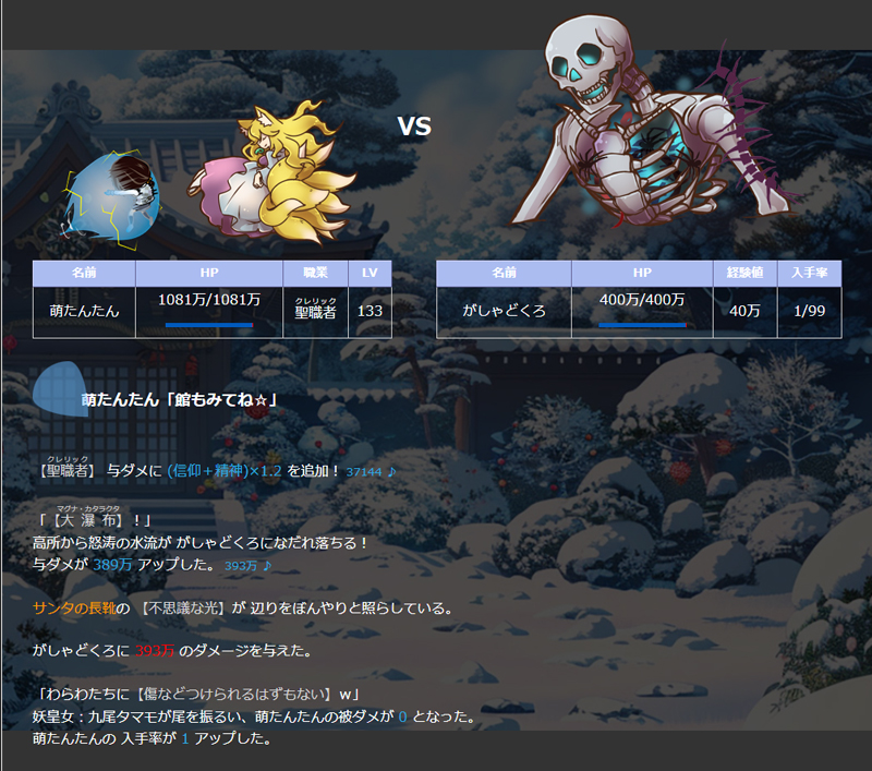 旧版は、1/4の発動フラグがたてば無条件で「10万以上の被ダメは10万になる」というぶっ壊れ性能でしたので、多少緩和させていただきました。1つ目のフラグとは別建てで、「現在HP以上の被ダメ」時に1/8で発動し、「被ダメが10万」となります。