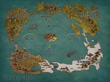 ■ 隣接:廃都街道、地下通路 《アウターフィーア(外四国)》の壱、機械文明がかなり発達した都市。全てのものが機械化されていて、人々は考えること(知能)と機械を動かすこと(器用)に長けている。身体全体を機械にしてしまったため、ものすごい腕力を持つ者も多い。 |