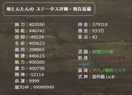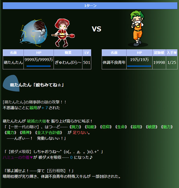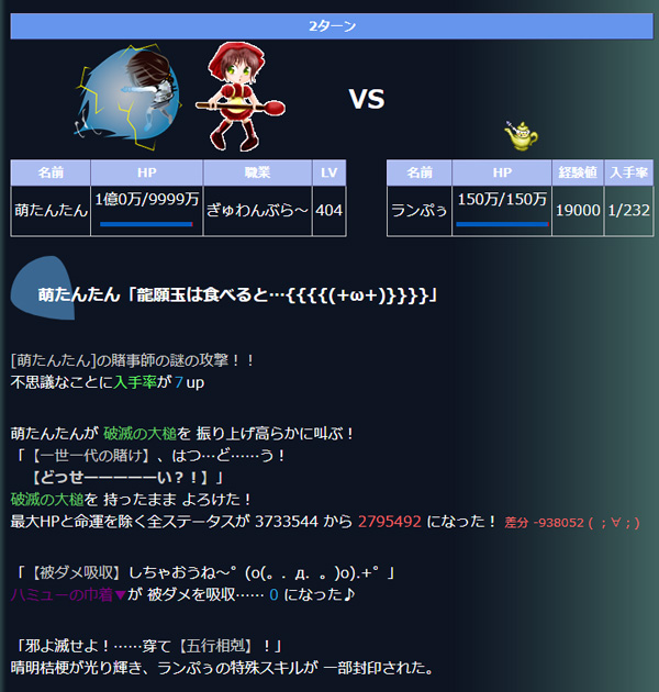 | 【ぎゅわんぶら~専用:一世一代の賭け】 | 特殊 | 非常に非常に《危険》 命運以外の各ステータスが最低5万、総合ステータスが100万以上の場合に、ターン中に1度発動。ターン数が増えるにつれ、倍率も増えるが、発動確率は減る。 | 破滅の大槌 |